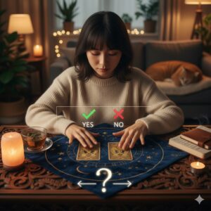 「気になる彼に、今すぐ連絡してもいい?」「このデートの誘いに乗るべき?」といった、具体的な行動についてYESかNOか、はっきりとした指針が欲しい時には、「2枚引き(イエスノー・スプレッド)」が非常に有効です。この方法は、あなたの質問に対して「実行すべきポジティブな側面(YES)」と「慎重になるべきネガティブな側面(NO)」を明確に示してくれます。